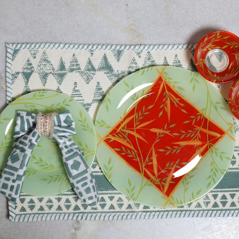 • 6 Placemats: Hand-block-printed geometric patterns in green on a natural cotton base