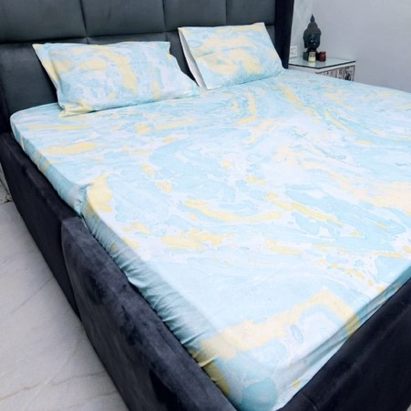 Immerse yourself in the serenity of the Aqua Marble Cotton Bed Sheet Set. Featuring a fluid marble-inspired design in delicate hues of sky blue and soft yellow, this set brings the tranquil beauty of nature to your bedroom. Crafted from 100% pure cotton, the bed sheet is smooth, breathable, and perfect for a restful night’s sleep. Complete with matching pillow covers, it offers a cohesive and calming aesthetic.