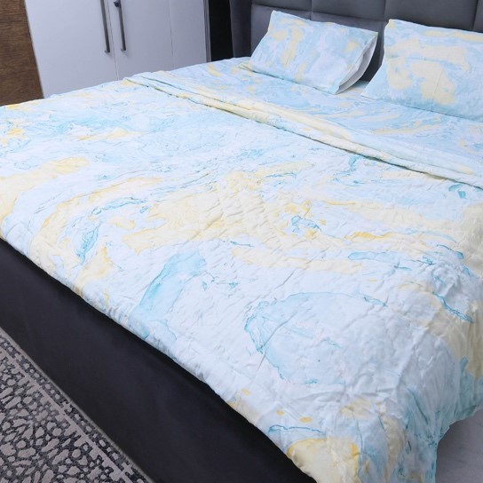 Transform your bedroom into a serene and artistic retreat with the Aqua Marble Quilt. Inspired by the natural beauty of marble, this quilt features fluid marble patterns in calming shades of blue and soft yellow, evoking a peaceful and tranquil atmosphere. Made with high-quality cotton, the quilt provides both comfort and style, perfect for elevating your bedroom decor