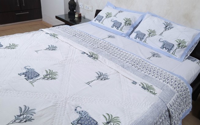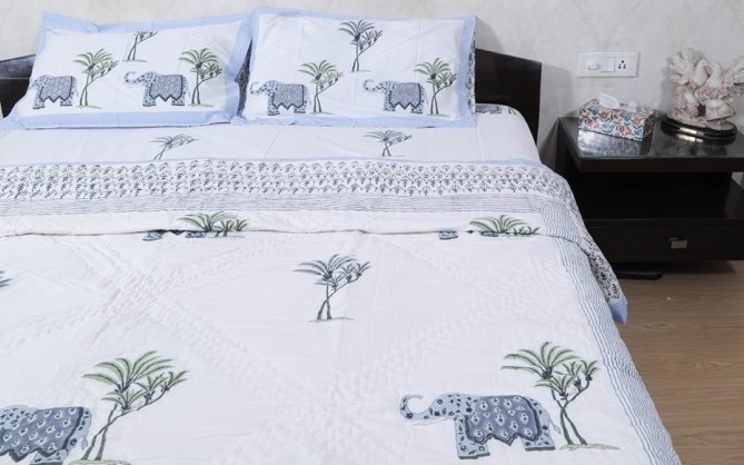 • Design: Reversible quilt with detailed blue elephant block prints on a cream background