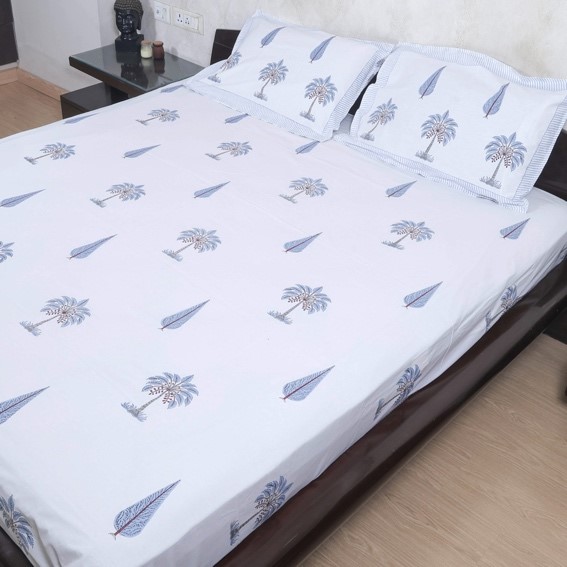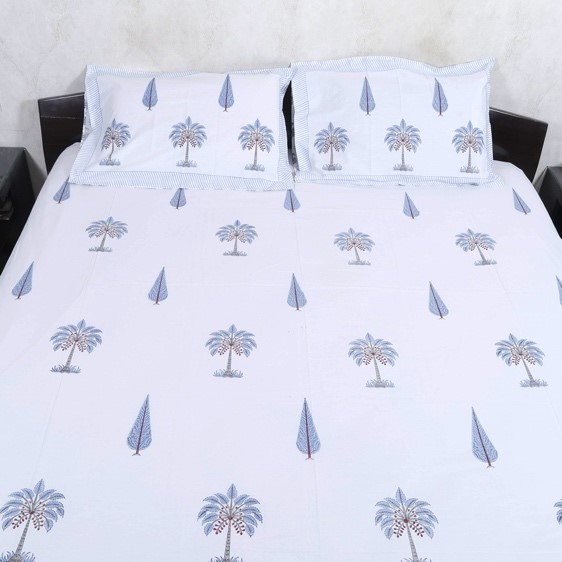 Transform your bedroom with the timeless elegance of our Blue Palm Trees Cotton Bedsheet Set. This 100% cotton bedspread features a stunning, reversible design adorned with intricate hand-block palm tree prints that celebrate India’s rich heritage. Luxurious and culturally inspired, this piece combines comfort with elegance, making it a perfect addition to any decor.