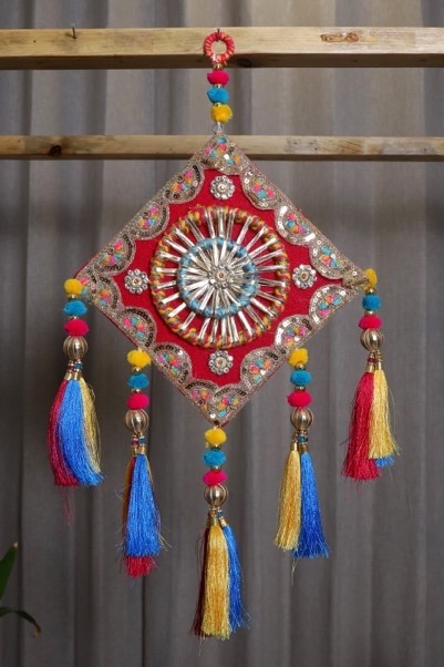 The Crimson kite side hanging is a vibrant, handcrafted d?cor piece inspired by the traditional kite design. This hanging feature a bold red diamond shape adorned with intricate gold patterns, colorful pom-poms, and tassels in red, blue, and yellow. Perfect for festivals or adding a festive touch to any space, it can be hung in doorways, windows, or on walls, bringing a warm and joyful ambiance to your home