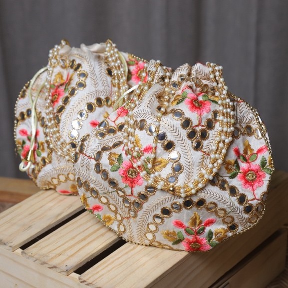 • A stylish accessory for events that demand a blend of beauty and utility.The Floral elegance potli is more than just a bag; it’s a piece of art that reflects timeless beauty and attention to detail, making it a wonderful addition to any festive ensemble.