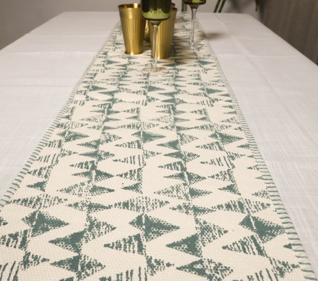 Elevate your table setting with this striking geometric green table runner. Featuring an intricate triangle pattern in shades of green on a neutral base, this runner adds a modern yet elegant touch to your dining decor. Crafted from premium-quality fabric, it ensures durability and style, perfect for daily use or special gatherings