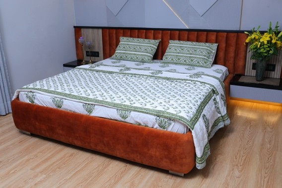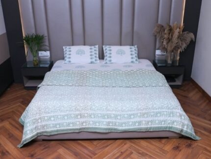 The Green Serenity Quilt brings nature-inspired elegance to your bedroom. Featuring soothing green botanical prints on a crisp white background, this quilt adds a fresh and peaceful vibe to any room. Crafted from 100% cotton, it offers a luxurious and comfortable feel, ensuring a restful sleep while enhancing the d?cor of your space