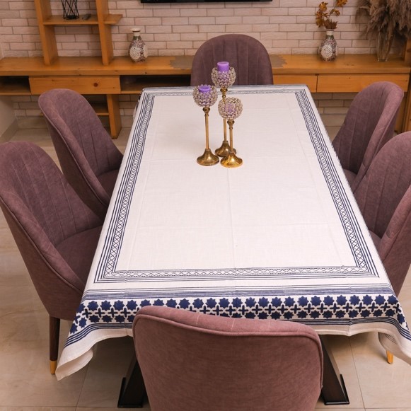 Transform your dining table with the sleek and minimalist style of our Midnight Geometric Cotton Tablecloth. Featuring a clean white background bordered by a sophisticated geometric pattern in deep navy blue, this tablecloth strikes the perfect balance between elegance and simplicity. The intricate design along the border adds a refined detail that enhances any dining space, making it ideal for both casual meals and formal dinners.
