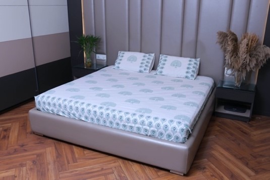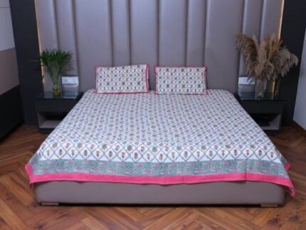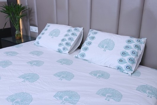 Embrace nature’s beauty with our Peacock Elegance Cotton Bedsheet Set. Featuring a delicate peacock motif in a soothing teal hue, this bedsheet brings a serene and stylish vibe to your bedroom. The subtle peacock feather border on the bedsheet and pillow covers adds an extra layer of sophistication. Crafted from 100% pure cotton, this set promises softness and comfort, perfect for a restful night’s sleep. Complete with two matching pillow covers, it ensures a coordinated and polished look for your bedroom