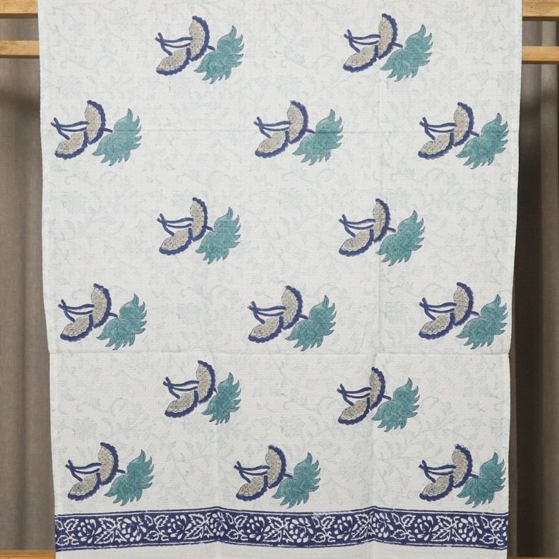 Elevate your home decor with the exquisite Peacock Grace Hand Block Printed Towel. Featuring an elegant peacock-inspired motif in shades of teal and navy blue, this towel showcases the beauty of traditional craftsmanship. The intricate floral border and subtle background detailing add a refined touch, making it a perfect blend of artistry and practicality