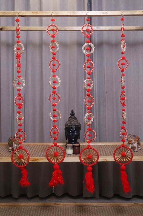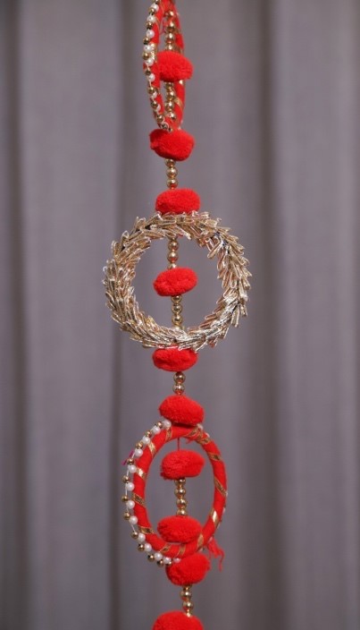 The Scarlet ring side hanging is a striking handcrafted d?cor piece designed to bring a vibrant and festive touch to any space. Featuring a golden ring adorned with bold red pom-poms and gold beads, this hanging adds a touch of elegance and warmth. Perfect for accenting doorways, windows, or walls, it is ideal for festive occasions or as an eye-catching everyday accent, enhancing the ambiance with its rich colors and unique design