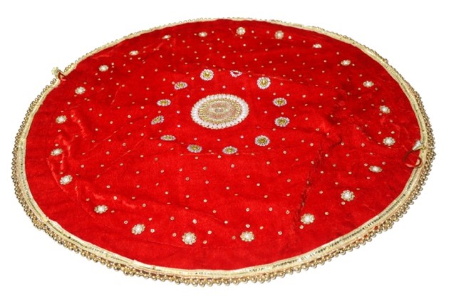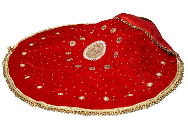 Add a touch of elegance to your ceremonial presentations with this exquisite Velvet Festive Thali Cover. Crafted from luxurious red velvet, it is adorned with intricate beadwork, shimmering sequins, and delicate embroidery, making it a perfect addition to your festive rituals. The golden border enhances its traditional appeal, providing a rich and festive look for any occasion.